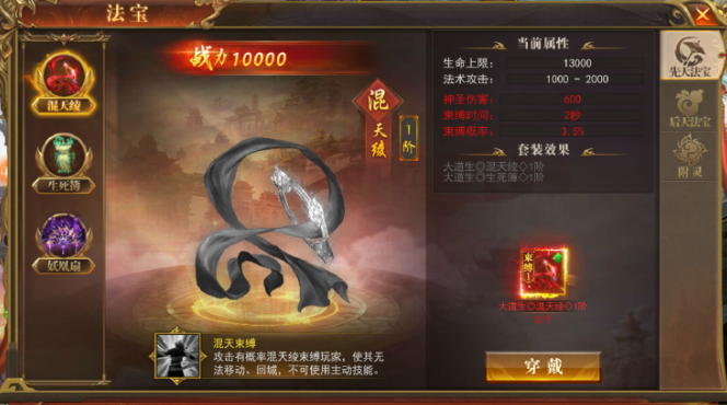 混天绫:攻击有概率束缚对手,使其无法移动、回城、使用主动技能