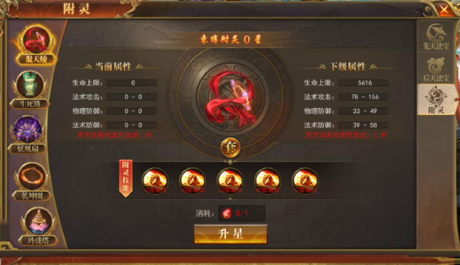 消耗对应附灵石可提升法宝属性,达到一定星级可激活增加法宝额外加强效果