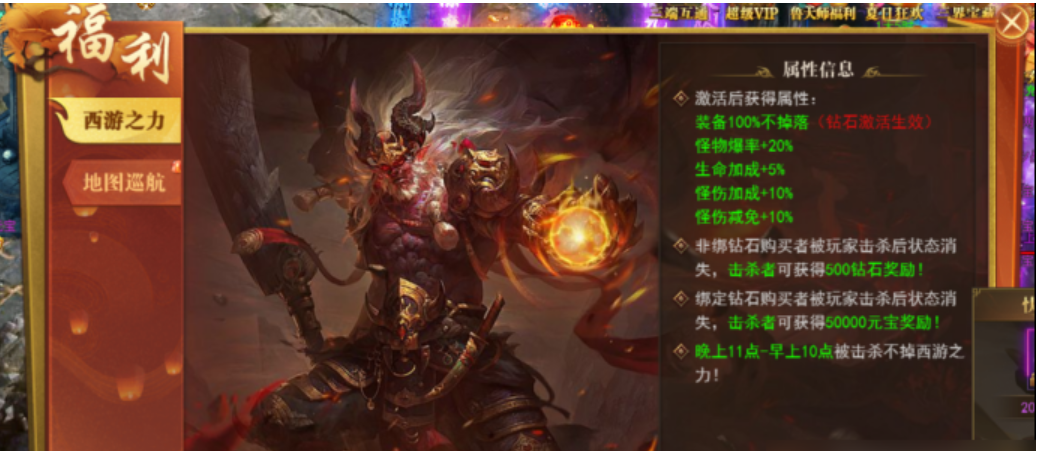 1、可钻石激活助力,花费1000钻石可激活西游之力,激活后即刻获得属性加成:装备100%不掉落、怪物爆率+20%、生命加成+5%、怪伤加成+10%、怪伤减免+10%、
