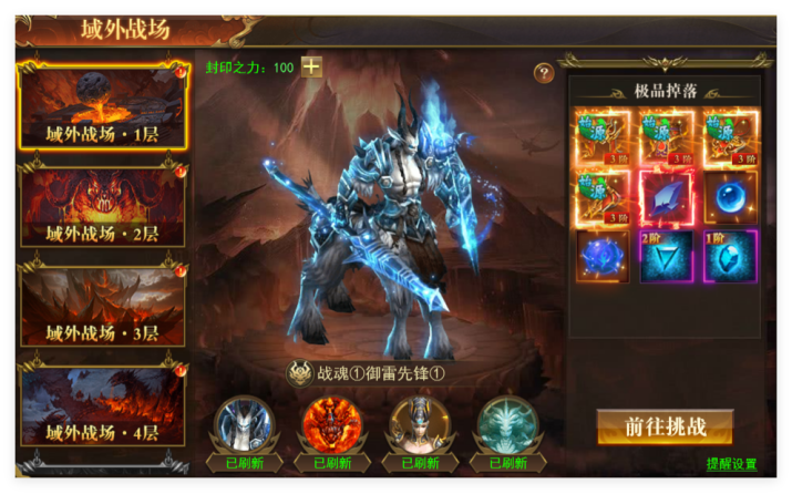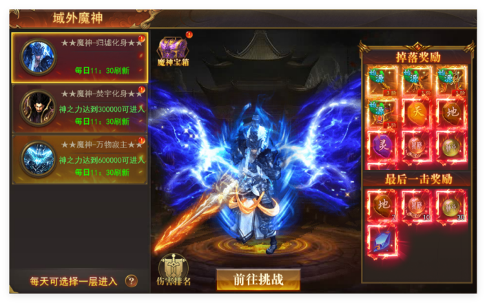 每日11:30魔神降临域外,每层BOSS独立计算奖励,玩家可选其中一层参与(每日仅可选一层进入,前往挑战后无法更改);