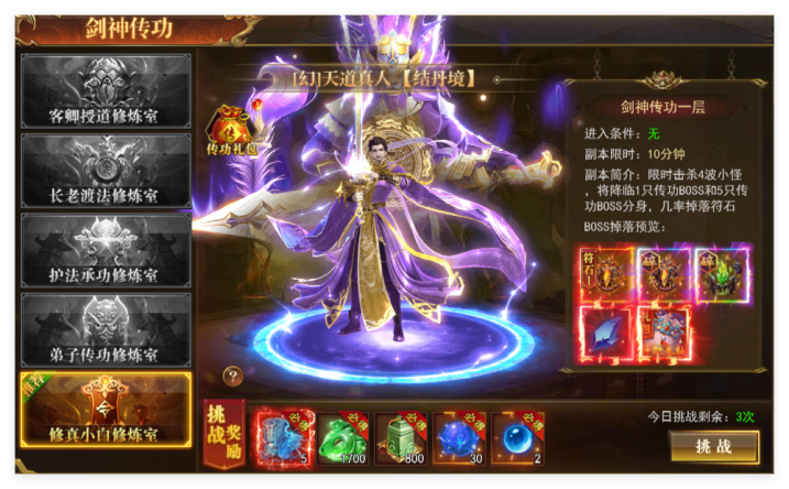 个人副本,通过激活传功令牌可进入不同的修炼室,修炼室越高级,奖励越好;