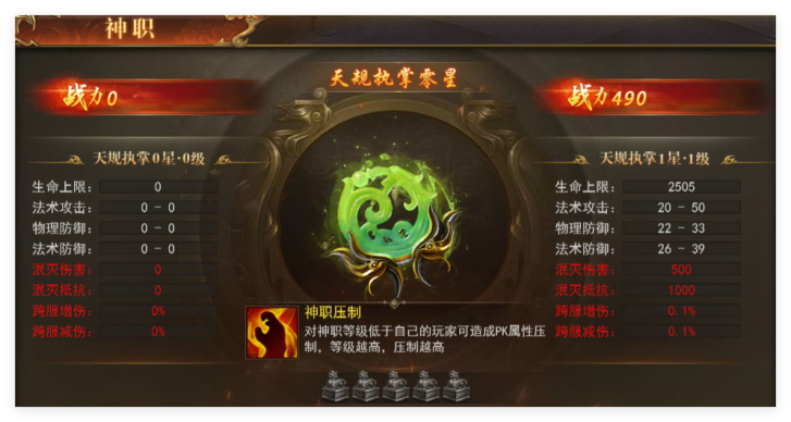 消耗灵玉和神职卷轴可升级神职,对神职等级低的玩家可造成PK属性压制,等级越高,压制越高。