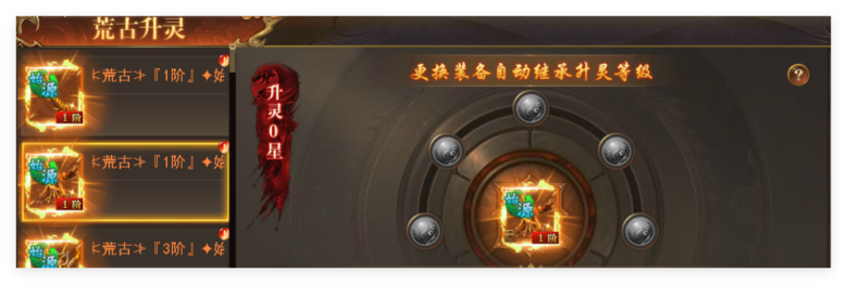 穿戴荒古装备后,消耗荒古精血、荒古精魄可对荒古装备进行升灵,获得大量基础属性和泯灭伤害,升灵至一定星级后还可获得对应槽位装备基础属性加成。