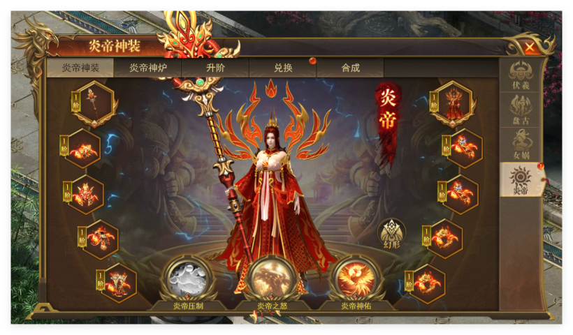 新增上古神装-炎帝神装,激活炎帝之力,获得额外属性加成和压制,集齐全套3阶激活神装幻化。