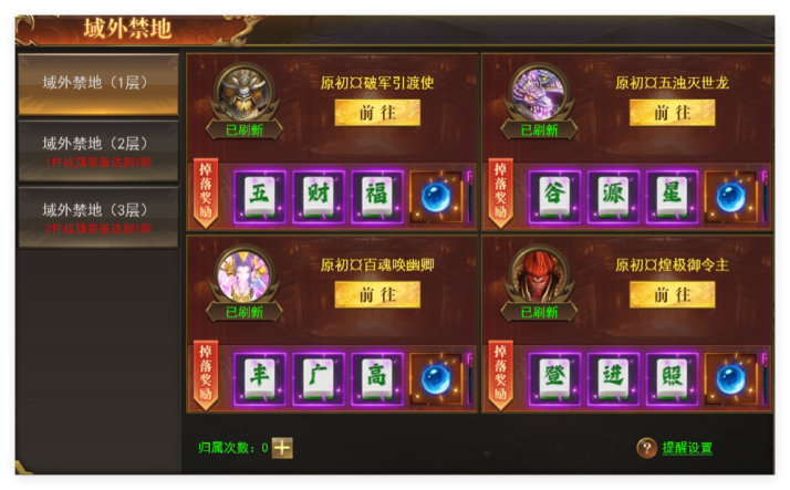 跨服副本地图,不同层数所需要的战旗装备不同,层数越高,奖励越好;