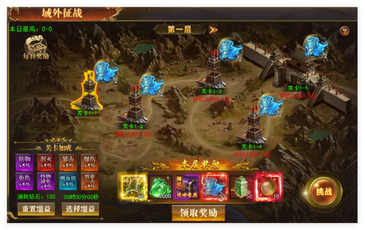指定时间内击杀关卡中的BOSS即为挑战成功并获得通关奖励,通关每一层的全部5关能领取本层奖励;